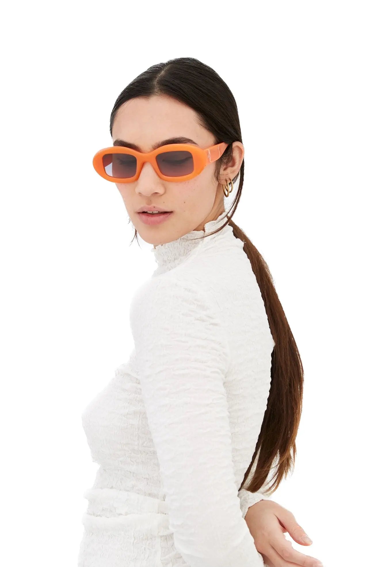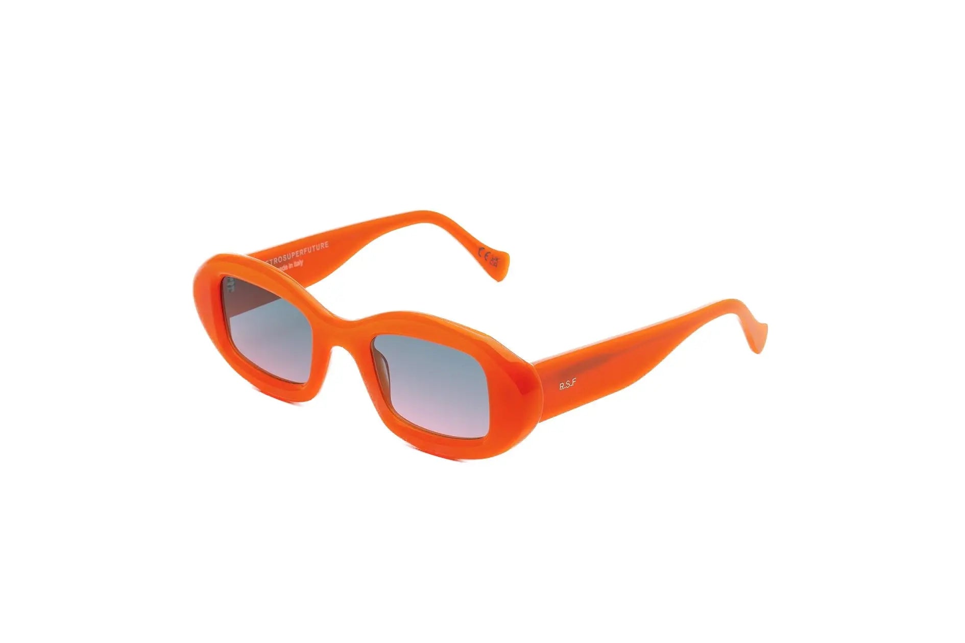 Contrasting geometries and sleek design characterise this modern icon: Tutto is a wide, horizontal shape featuring tick and curvy rims encasing squared lenses. Conceived as a playful yet ultra stylish silhouette, the Tutto embraces the timeless glamour of 1960s feminine shapes with a grungy contemporary unisex edge. This version of the Tutto features a bold orange acetate with purple fading lenses.