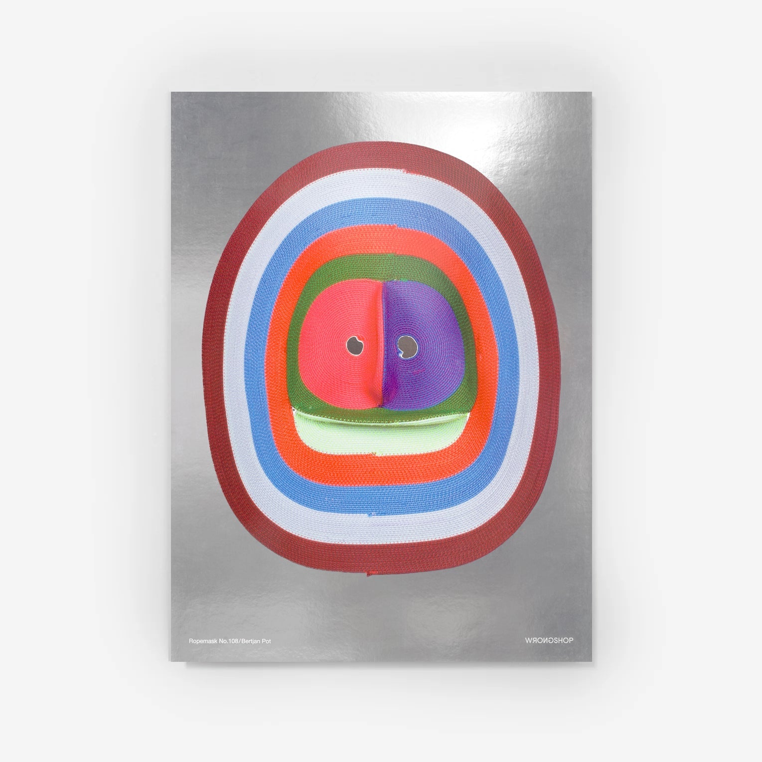 This high-quality poster translates an original mask from Bertjan Pot's Ropemasks series into vibrant digital prints. The artist's surreal style is emphasised through the superimposed image and paired with a unique mirrored background. Our thick, semi-reflective Mirri Silver paper simulates the material experimentation seen in his work. Read more about the series from Bertjan here.
