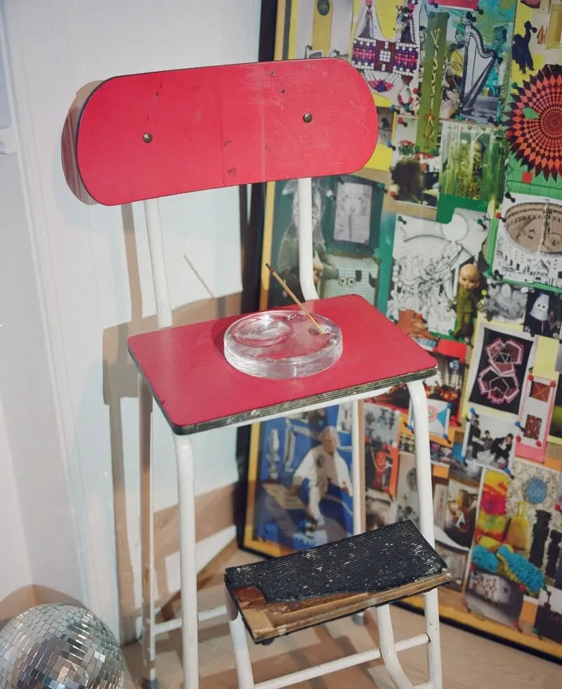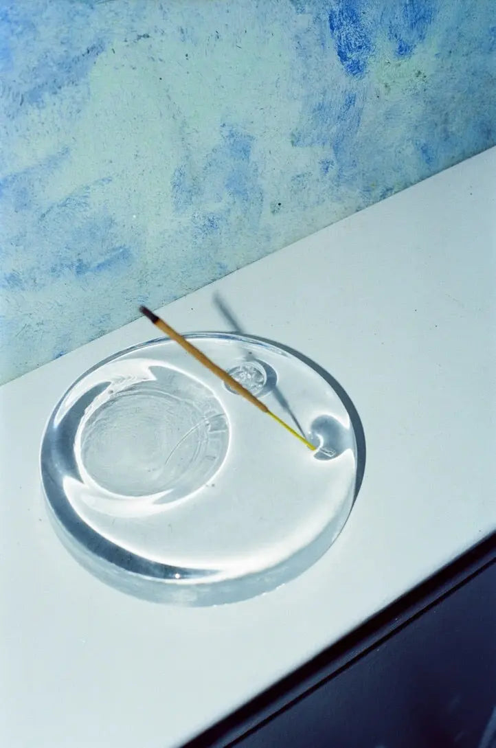 Hot glass drops to cooler metal. The shock looks like agitated freshwaters or skin on overripe peaches. This trick is bottom of pool. The top is pierced by metal and curved by wood to catch stick and dust. Glassware set up to thicken the air - to highlight atmosphere with a fluorescent pink marker. Fire up aestheticization of the lower skies to remind lungs to inhale and brain to trust that oxy is shared. Inhale your next in communal clouds of sage. Remember you once breathed underwater.