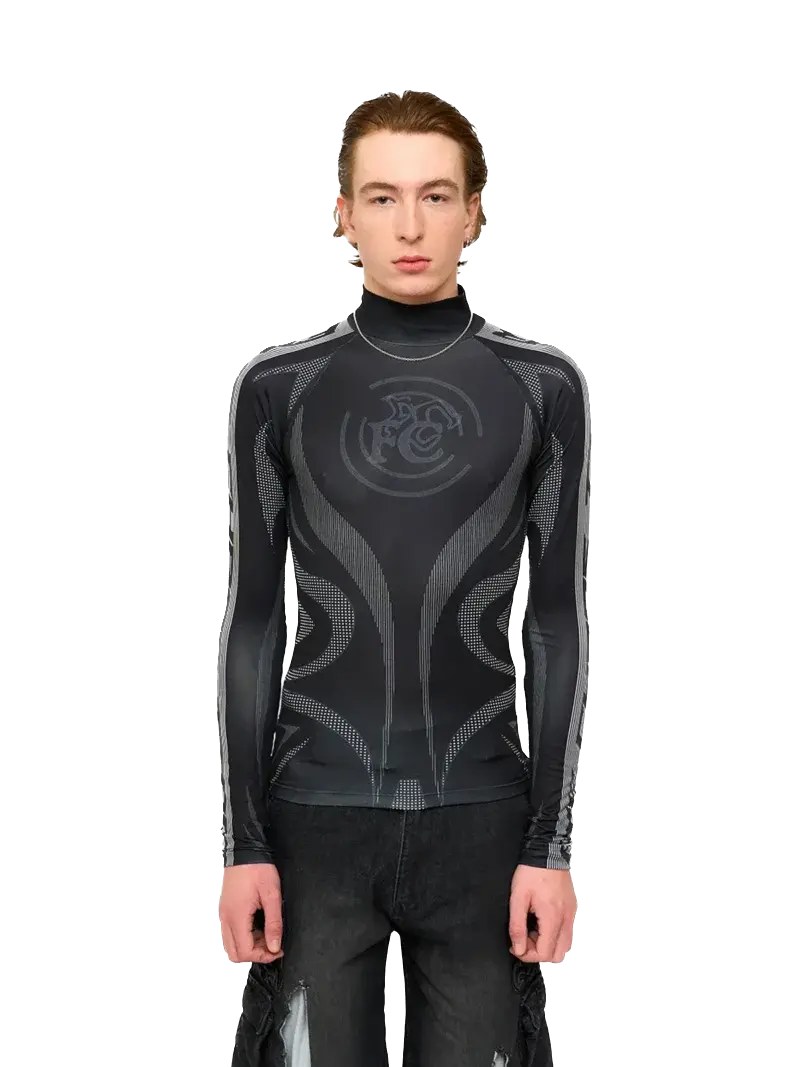 胸元をアートワークで飾った、伸縮性のあるジェンダーレスな長袖