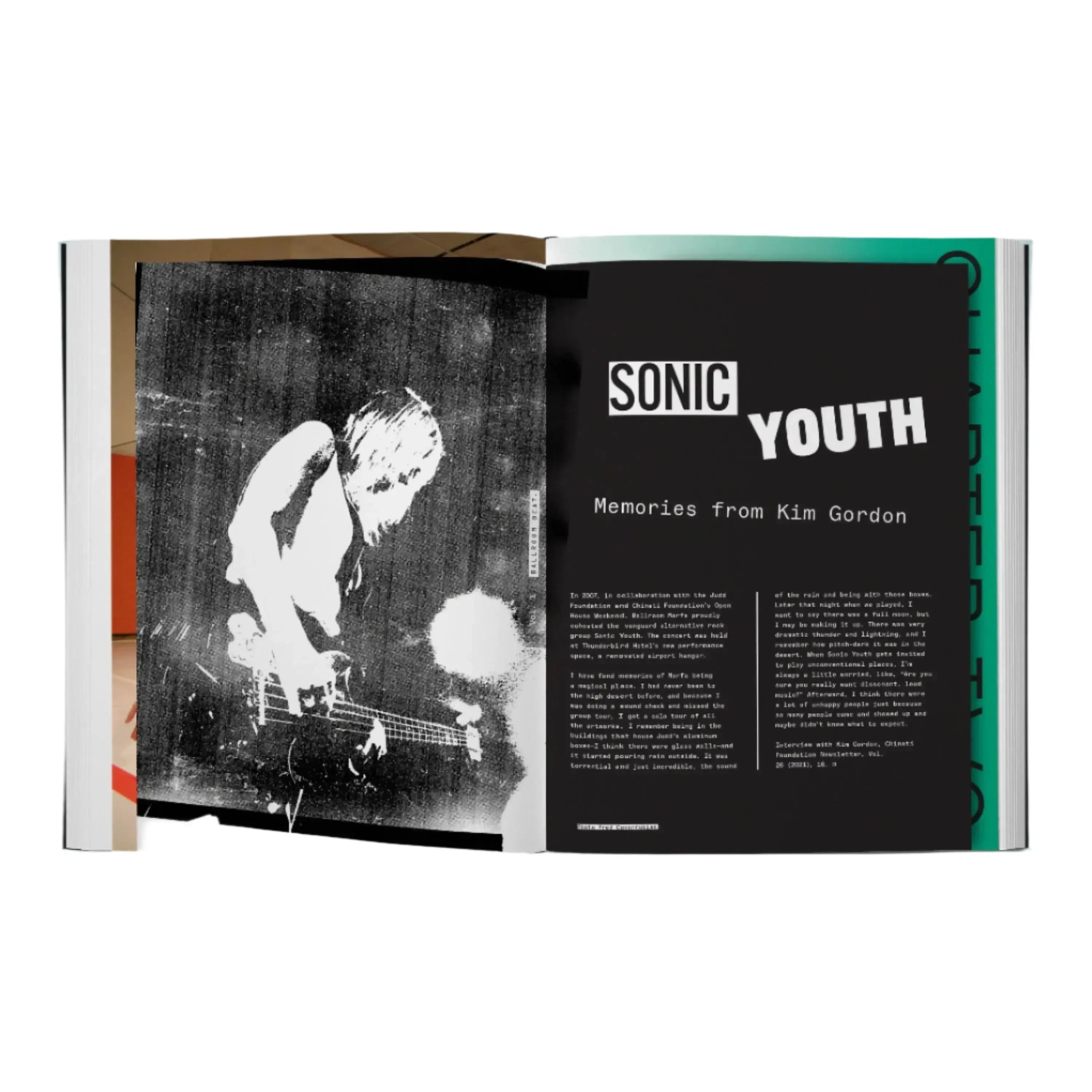『ボールルーム マーファ: 最初の 20 年間』は、テリー アレン、メル チン、アグネス デネス、ラファ エスパルザ、ロイ ホロウェル、エルムグリーン & ドラッグセット、ハバード/バーチラー、グラハム レイノルズなど、世界的に有名なアーティストやパフォーマーによる生き生きとした直接の証言を通じて、この特別な芸術の目的地の物語を語ります。また、ロッキー エリクソン、ヘラド ネグロ、スザンヌ シアニ、ロニー ホリー、ライル ラヴェット、ララージ、ジョアンナ ニューサム、パフューム ジーニアス、ファラオ サンダース、ソニック ユース、スプーン、ワイヤーなど、数え切れないほど多くのミュージシャンによる 20 年間の刺激的なパフォーマンスを収録した 3 つのジンも含まれています。