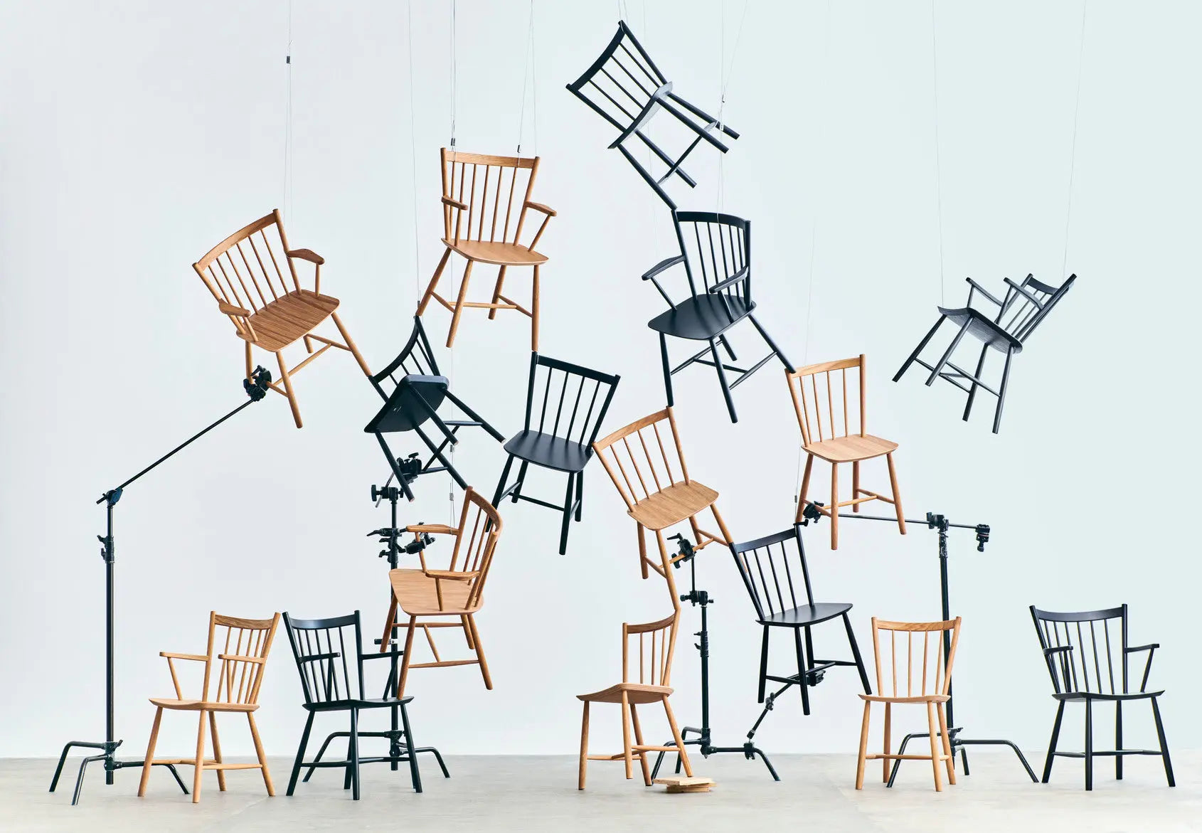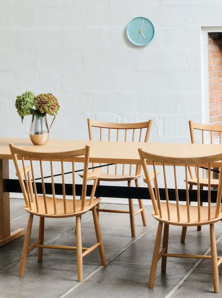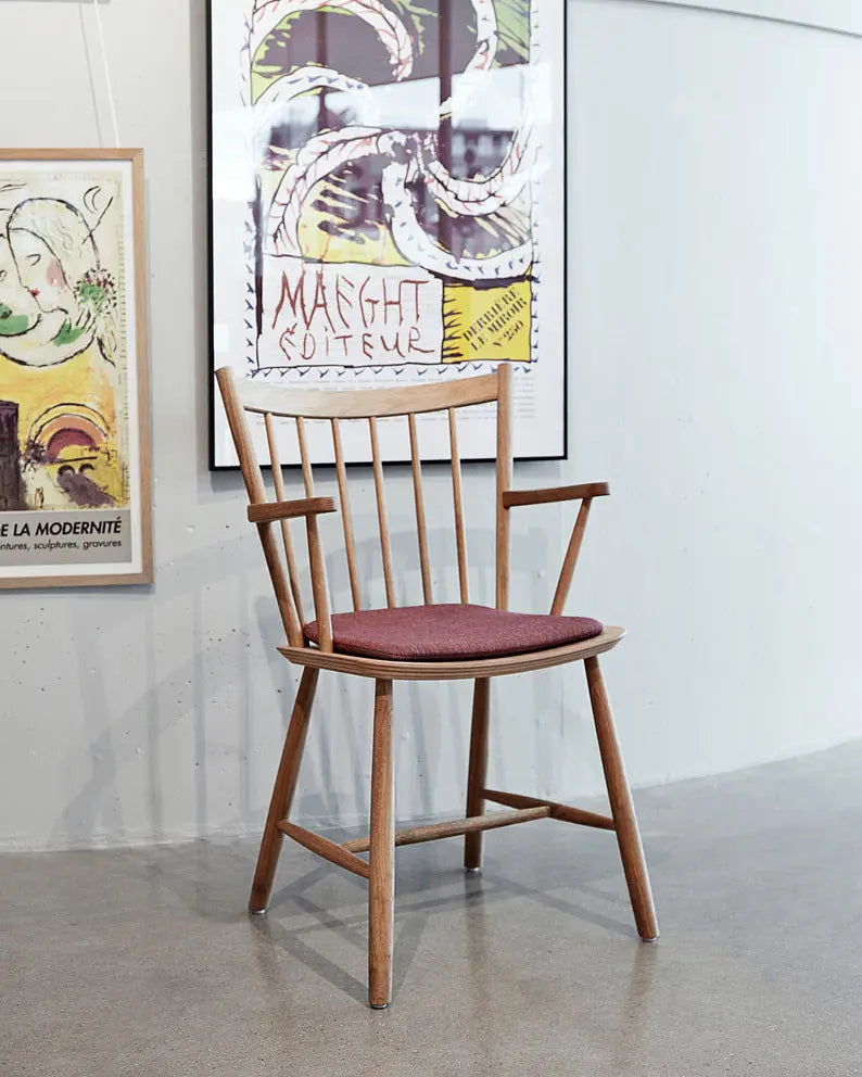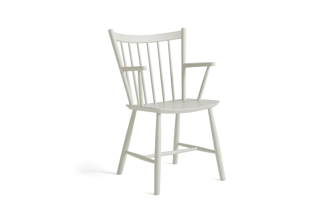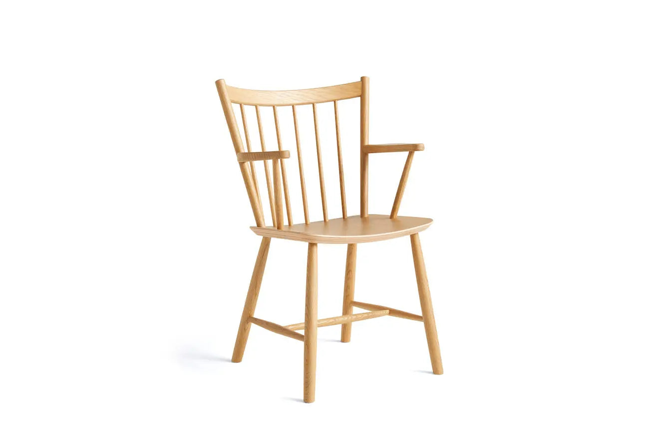 HAY がボーエ・モーエンセンの名作 J42 チェアを再現したこの椅子は、彼のデザイン哲学をはっきりと反映しています。シンプルな水平線と垂直線による正確な比率で、湾曲したスピンドルの背もたれと角張った肘掛けが作られています。無垢材で作られたこのデザインは、時代を超えた品質で、いつまでも快適です。オーク材またはブナ材で、さまざまなオイル仕上げ、ナチュラル仕上げ、カラー仕上げからお選びいただけます。