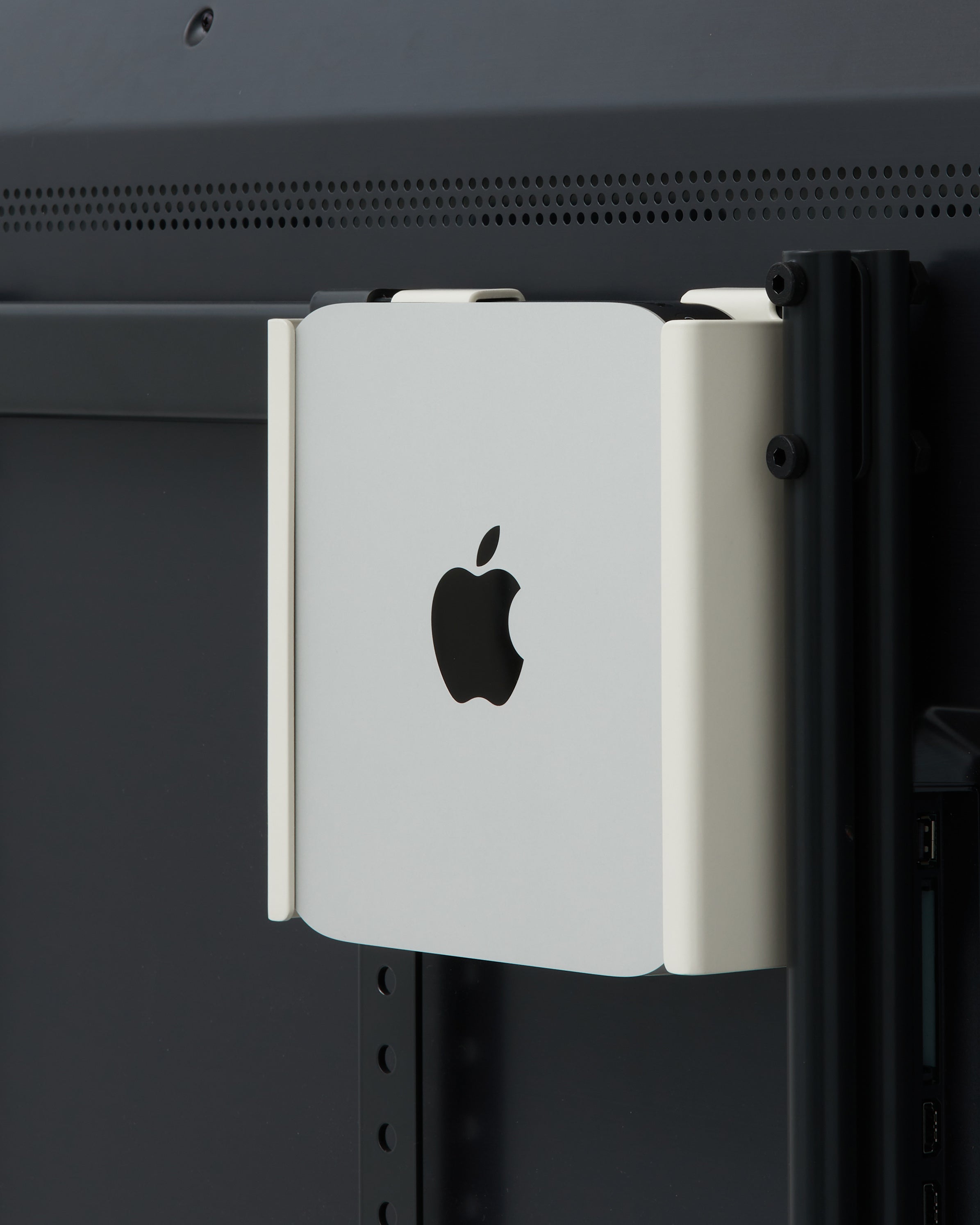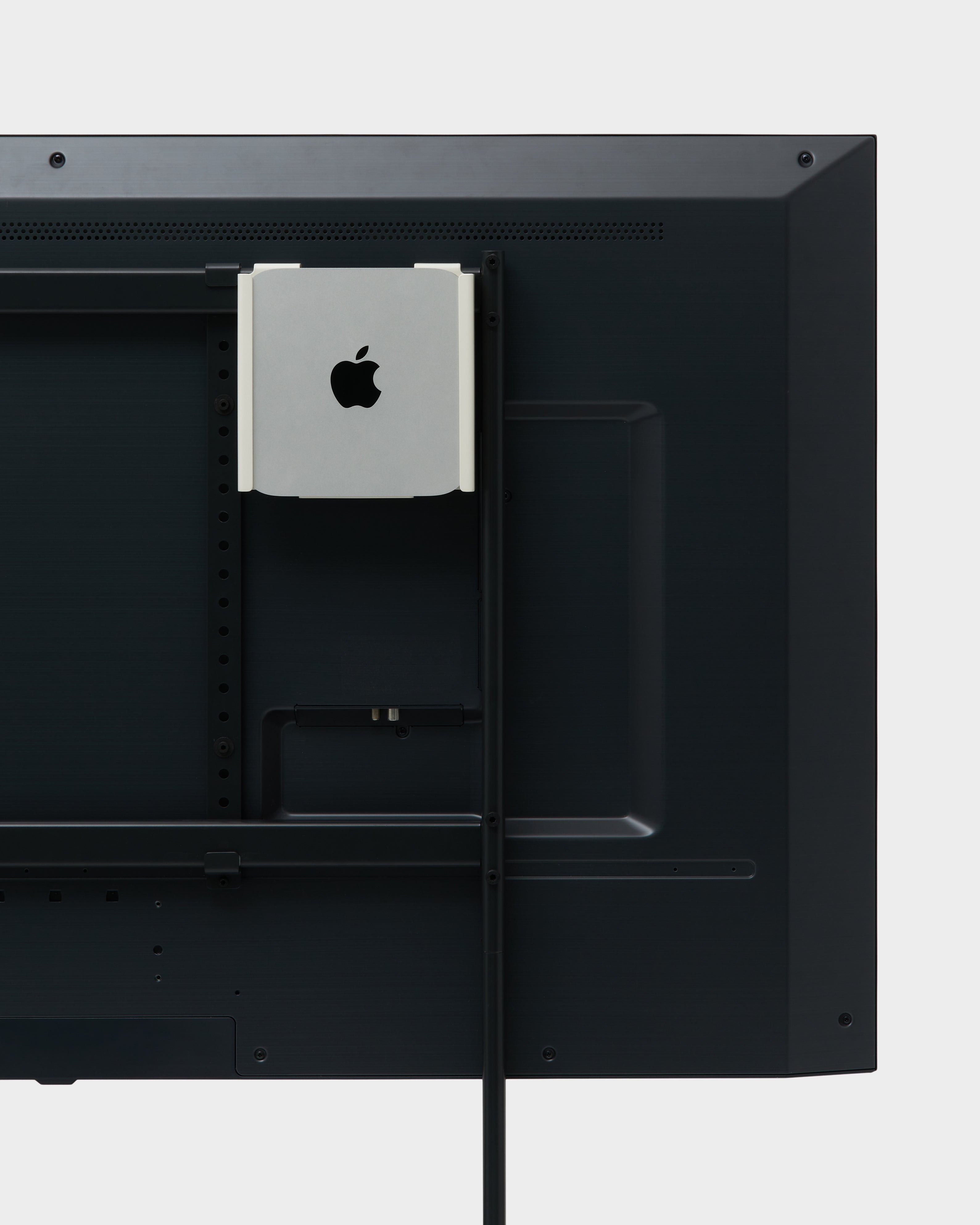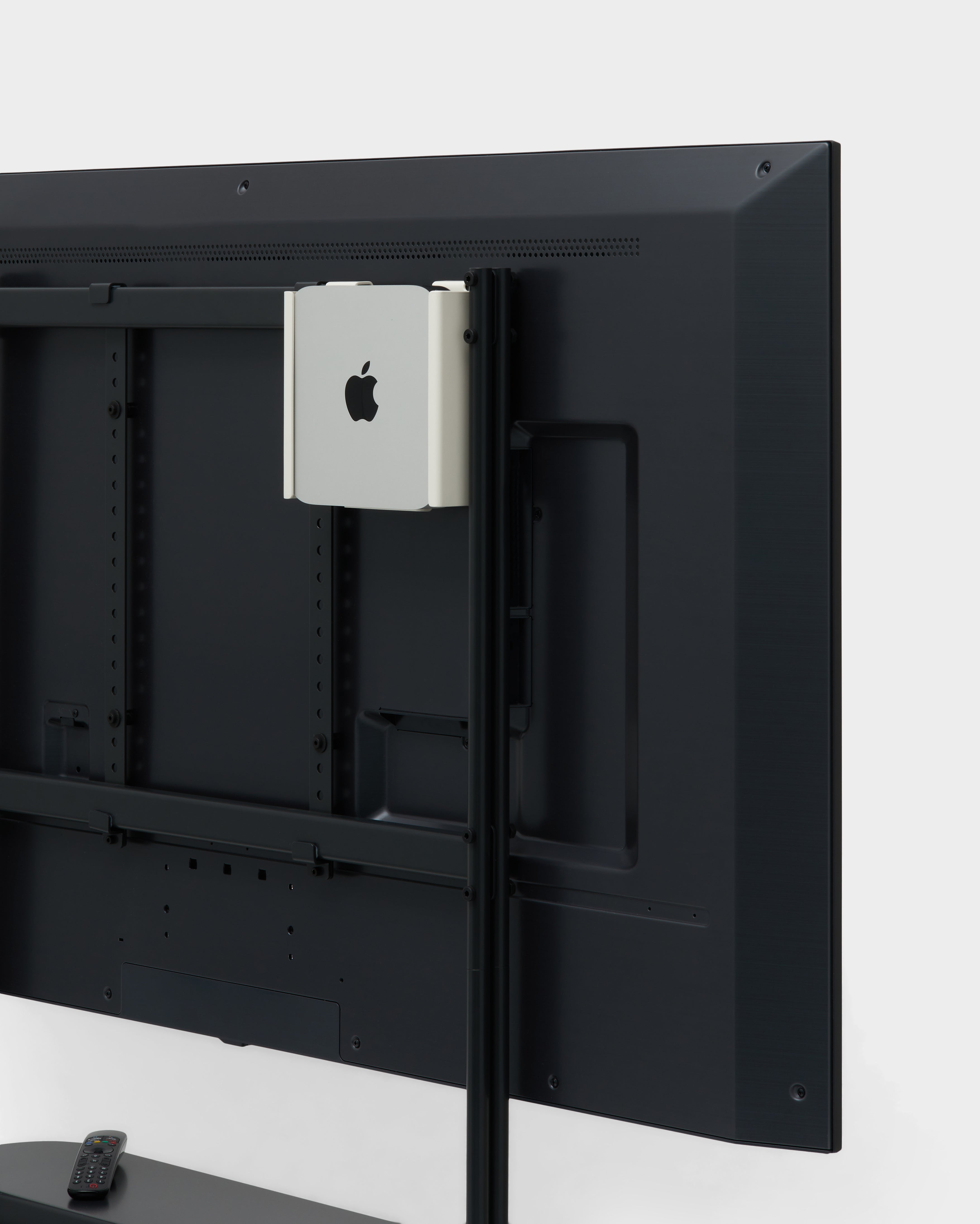 The Mac Mini Mount is a functional design that ensures that your Mac Mini becomes an integral part of your TV stand. The Mac Mini Mount is placed on the TV stand behind the TV screen. Mac Mini Mount is made of steel and fits all our stands except for Viva.
