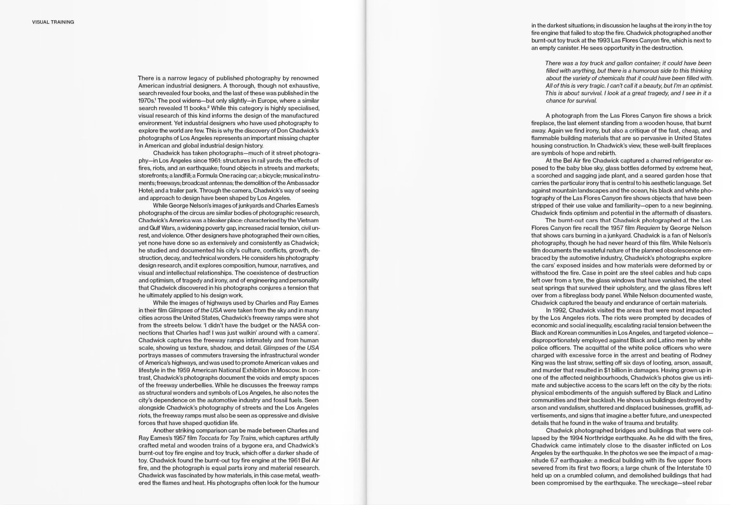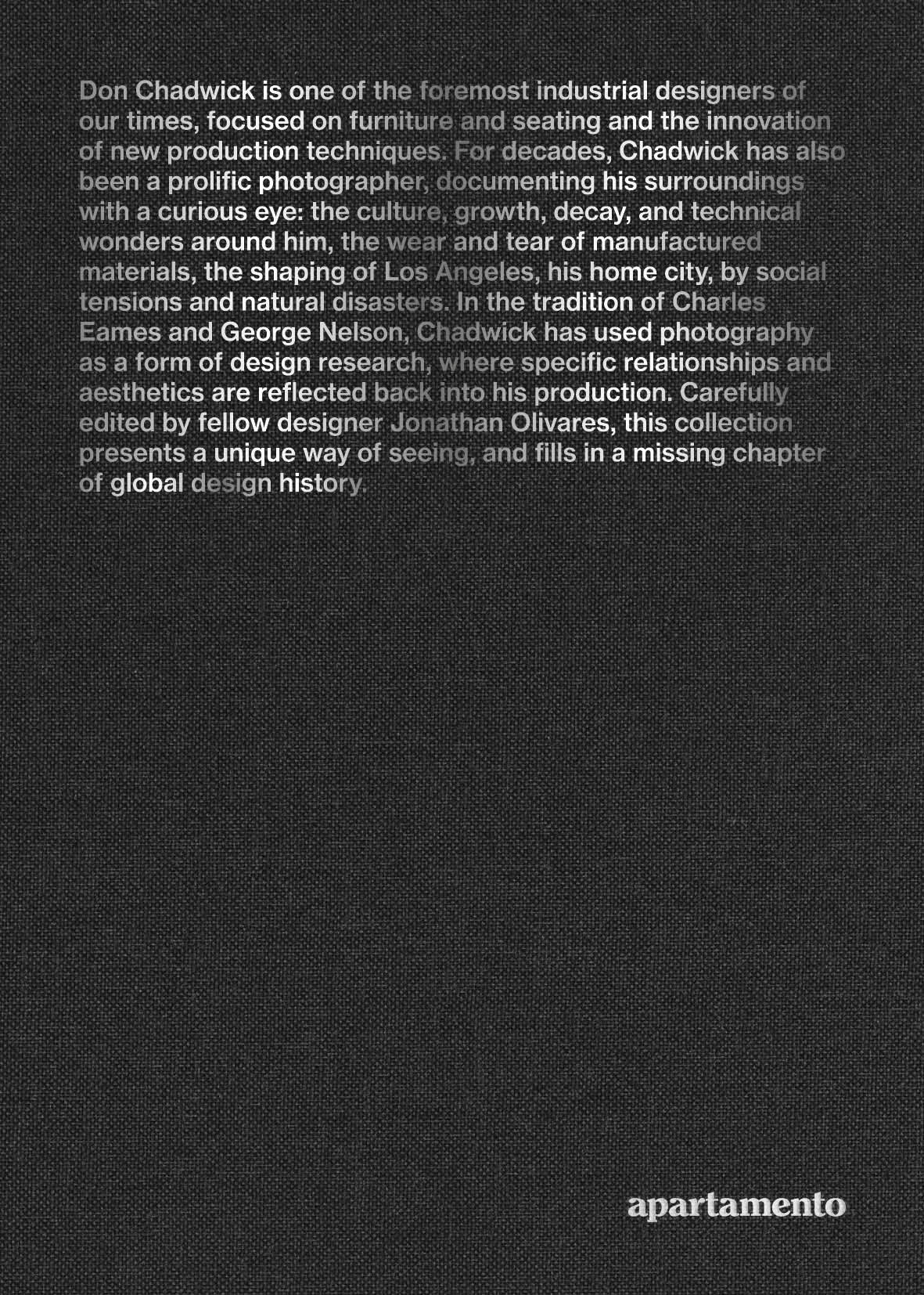 唐·查德威克是当代最杰出的工业设计师之一,专注于家具、座椅以及新生产技术的创新。几十年来,查德威克也是一位多产的摄影师,他以好奇的眼光记录着周围的环境:他周围的文化、发展、衰败和技术奇迹,制造材料的磨损,以及社会紧张局势和自然灾害对他家乡洛杉矶的影响。