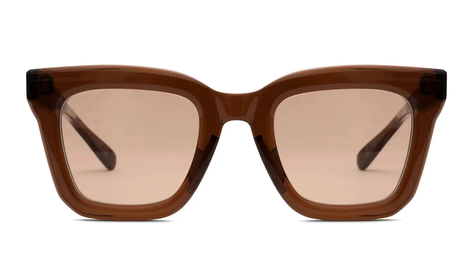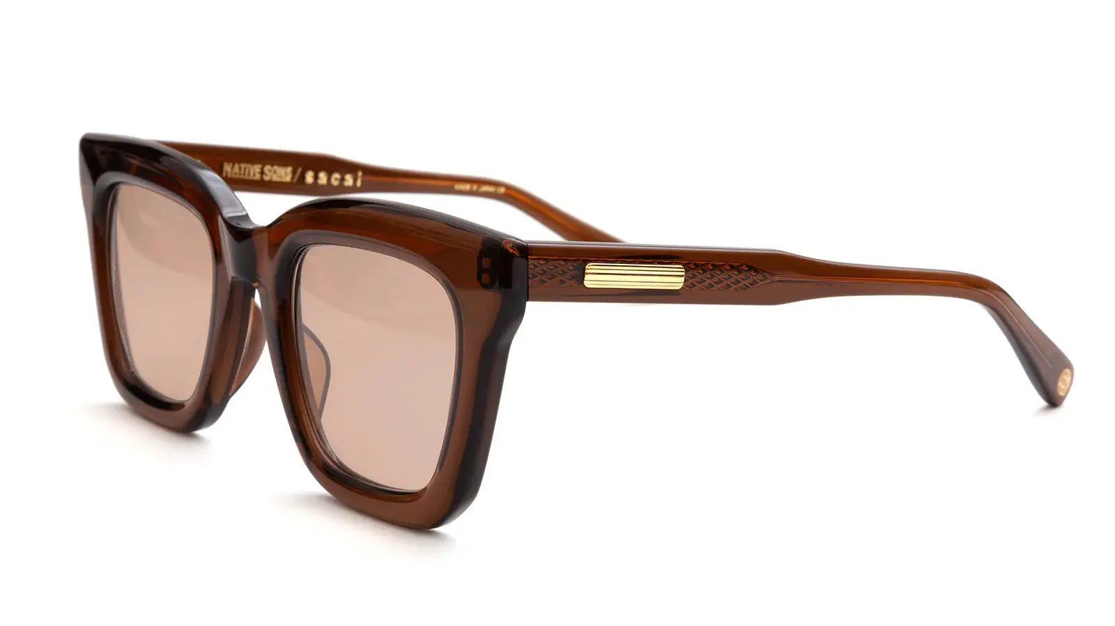 棕色方形框架太阳镜,两侧饰有金色细节。