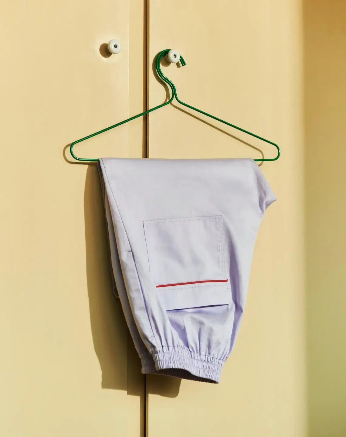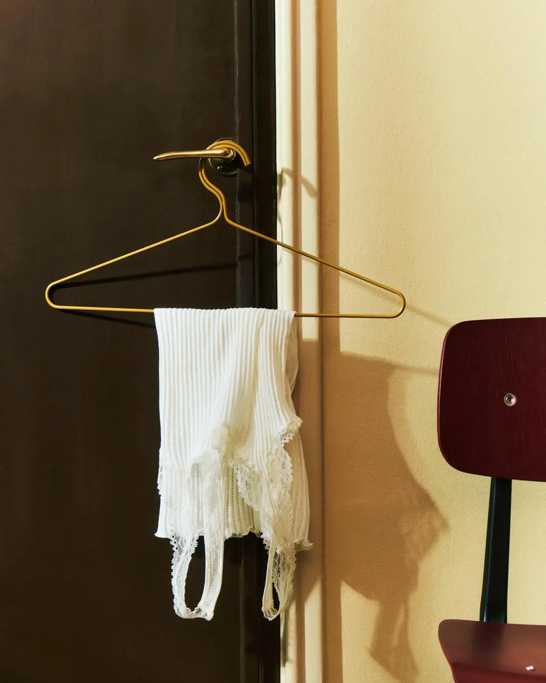 Muller Van Severen 的彩色衣架是一款极简主义风格的衣架,设计独特,色彩缤纷。它采用钢丝制成,采用连体挂钩设计,不仅美观大方,还兼具强度。这款衣架有多种颜色可供选择,可以随意搭配,并以三个为一组出售。